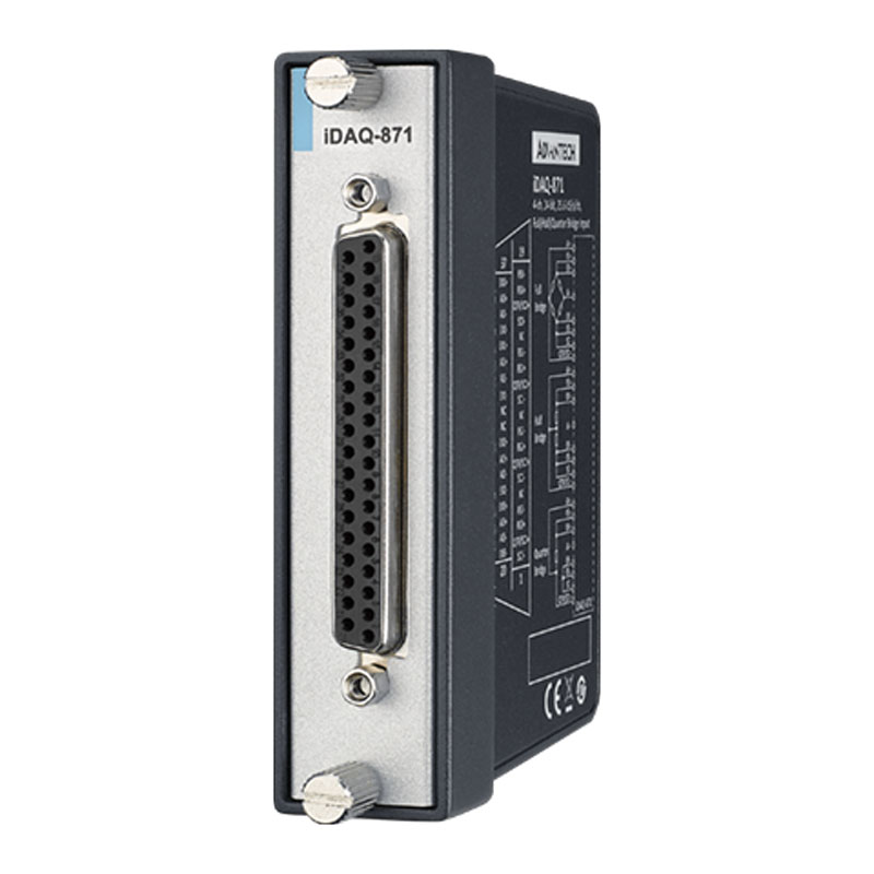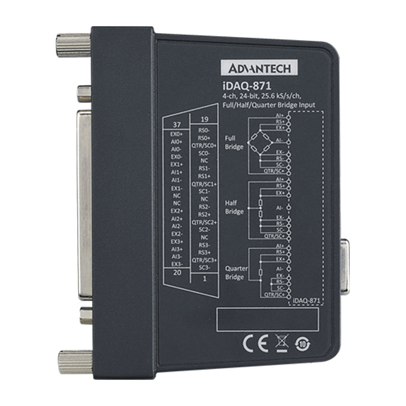 Es besitzt eine integrierte Wheatstone-Brücke. Die 4 analogen Eingangskanäle besitzen eine Auflösung 24 Bit Auflösung mit einer maximalen Abtastrate von 25,6 kHz pro Kanal. Mit dem eingebauten Digital-Filter können unnötige Geräusche herausgefiltert werden, was zu einer Verbesserung des Signal-Rausch-Verhältnis führt. Mehrere Triggermodi sorgen für flexibel konfigurierte Erfassungszeitpunkte. Natürlich kann das Modul mit anderen iDAQ-Modulen synchronisiert werden.